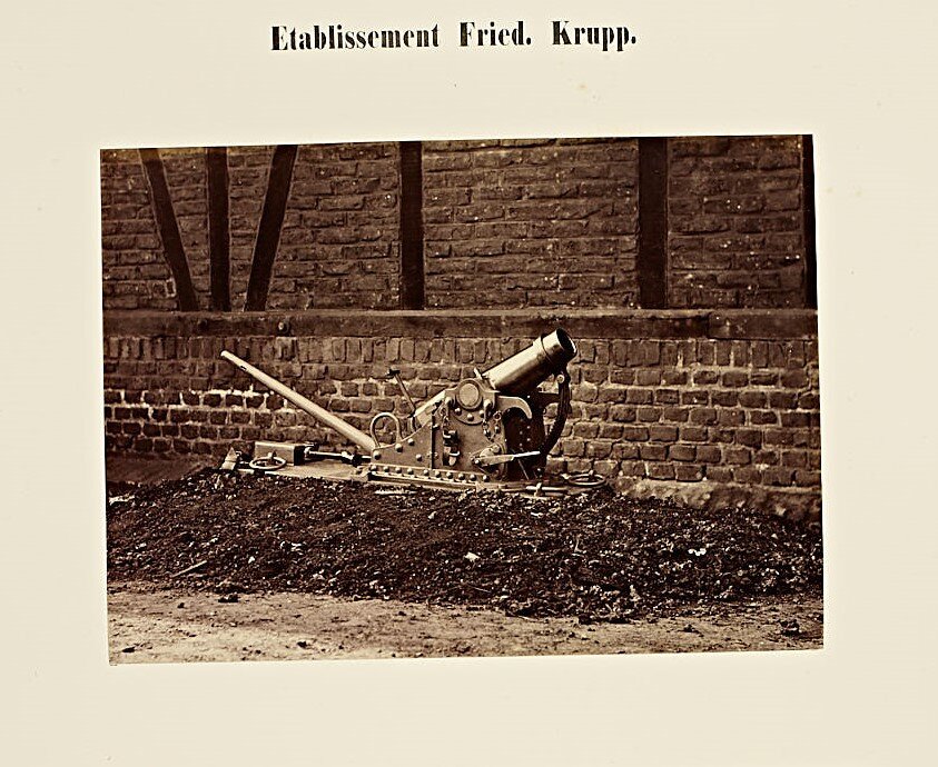 Орудие на рамном гидропневматическом лафете Крупа с механическим приспособлением для наведения и заряжения.